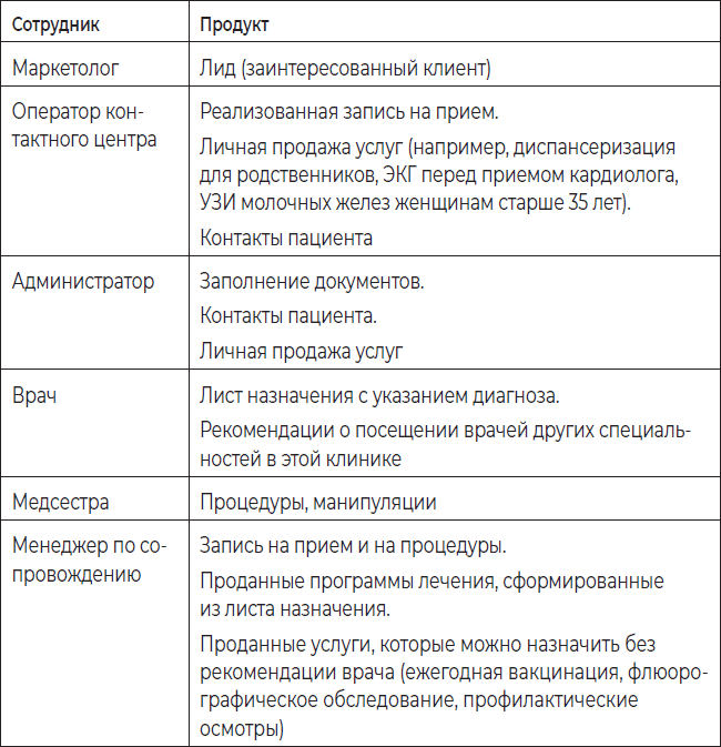 На обувной фабрике производят сапоги, на кирпичном заводе – кирпичи, на ткацкой фабрике – километры ткани, а что производится в клинике оператором контактного центра, менеджером, врачом? Что является продуктом производства каждого сотрудника, какую пользу он приносит? Кто из сотрудников что продает? Давайте разбираться. Изучите табл. 3, а дальше я поясню ключевые моменты.