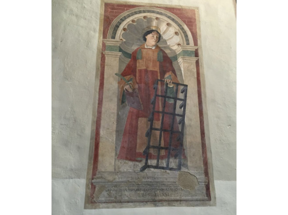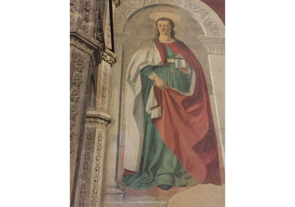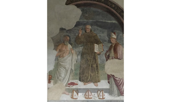 В Святом Августине молодой человек в «гражданском» шепотом здоровается и готовится встать на колени для молитвы; он здешний смотритель, тактично не гонит единственного посетителя, я осмотрю стены и выйду, он с облегчением запрет дверь на засов и пойдет разговаривать с Богом, как раз когда я спускаюсь с крыльца, колокольня взрывается звоном. Фреску с изображением святых Бернардино Сиенского, Иеронима и Игнатия Антиохийского (15 век) нашли только в 2002-м. Как, что там было сверху, кто и зачем прятал ее?