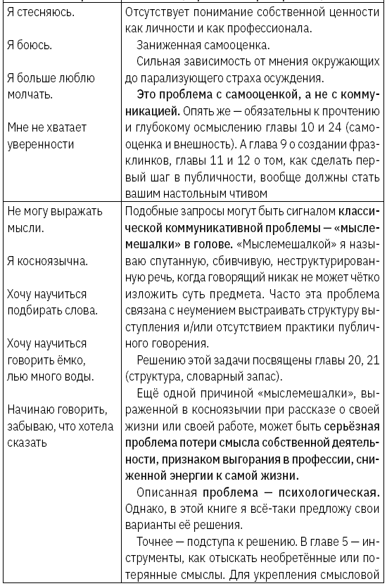 В этой главе поговорим о том, с какими запросами обычно люди приходят к специалистам по ораторскому искусству, и что на самом деле скрывается за этими формулировками. Ваша задача, читая, обнаружить тот пункт, который касается именно вас. Задача – поиск именной ВАШЕЙ первопричины, почему же НА САМОМ ДЕЛЕ вы держите в руках эту книгу. Что вы хотите от неё получить? Опять призываем на помощь безжалостность к себе.
