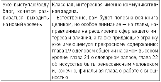 Вот она, основная формула алхимии успешной публичной коммуникации: вашему богатому, цветистому, звенящему, глубокому содержанию, жизненному и профессиональному опыту нужно всего лишь придать респектабельный и эффектный внешний вид. Ваше содержание, уникальный опыт и знания ПЕРВИЧНЫ. Задача этой книги – всего лишь подобрать для них нужное обрамление и помочь выбрать инструменты продвижения.