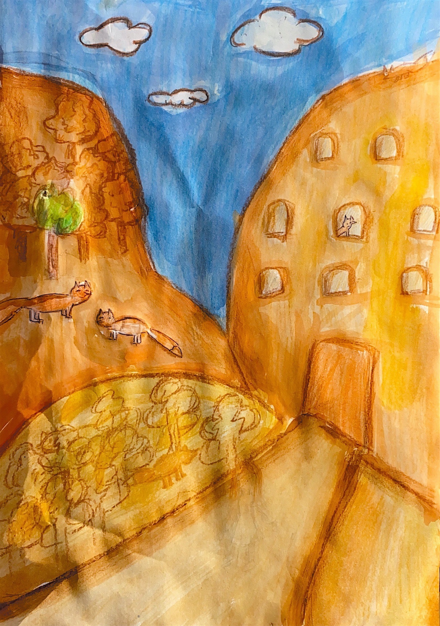Вася рассматривала всё вокруг: домики, покрытые коричневой черепицей, клумбы, на которых росли жёлто-оранжевые цветы, холмы, что виднелись вдали. И тут она стала различать, как незаметно перемещаются жители этого королевства: мелькнули ушки из травы, а там, где росли чёрные ягодки, высунулся носик и, втянув воздух, скрылся обратно. Рыжие шкурки прекрасно маскировались в этой осенней долине, а носики можно было спутать с ягодками или камешками. Пушистый хвостик заметал следы быстро удаляющейся лисички.