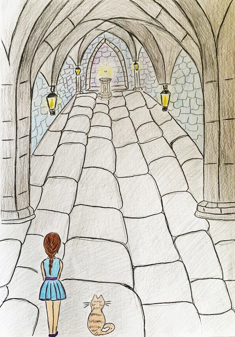 Пройдя по извилистым коридорам за́мка, Василиса и Анфиса очутились в сыром и тёмном зале. Стены его были обвиты плющом, пол отчасти залит водой, пахло тиной и сыростью.