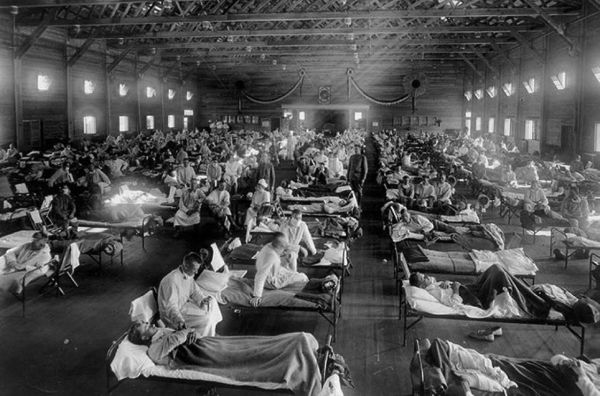 Солдаты заболевали пневмонией в результате вторичного контакта с носителями инфекции, на фоне иммунитета, ослабленного гриппом в местах принудительного скопления людей, где были плохие санитарные условия – в переполненных казармах, бараках, тюрьмах, теплушках и лазаретах. В общей сложности, считается, что «испанкой» заболело 500 млн человек, а погибло от неё от 50 до 100 млн[25]. После окончания войны солдаты, возвращаясь в свои страны, продолжали распространять болезнь по всему миру, но к концу 1919 г. по мере того, как исчезали принудительные скопления людей в замкнутых пространствах в условиях антисанитарии и крайнего стресса, менингит и «испанка» исчезли[26].