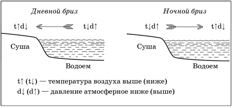 Бриз – местный ветер (морских побережий, больших озер, водохранилищ и рек), который меняет свое направление дважды в сутки: днем он дует со стороны водоема на сушу, а ночью – с суши на водоем. Бризы возникают оттого, что днем суша нагревается больше, чем вода, отчего более нагретый и легкий воздух над сушей поднимается вверх и на его место поступает более холодный воздух со стороны водоема. Ночью же над водоемом воздух теплее (т. к. медленнее остывает), поэтому он поднимается вверх, а на его место передвигаются массы воздуха с суши – более тяжелые, прохладные (рис. 12). Другими видами местных ветров являются фен, бора и др.