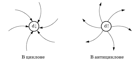 Циклоны и антициклоны. Вследствие неравномерного нагревания земной поверхности и отклоняющей силы вращения Земли образуются огромные (до нескольких тысяч километров в диаметре) атмосферные вихри – циклоны и антициклоны (рис. 13).