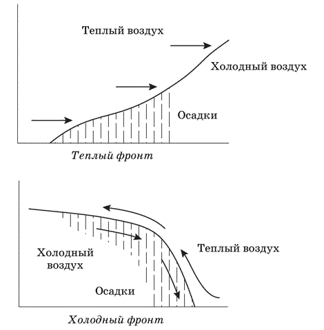 Атмосферный фронт – зона раздела различных по свойствам воздушных масс в тропосфере. Возникает при сближении и встрече масс холодного и теплого воздуха. Его ширина достигает нескольких десятков километров при высоте в сотни метров и протяжении иногда в тысячи километров при небольшом уклоне к поверхности Земли. Атмосферный фронт, проходя по определенной территории, резко изменяет погоду. Среди атмосферных фронтов различают теплый и холодный фронты (рис. 14)