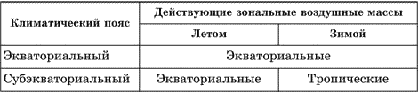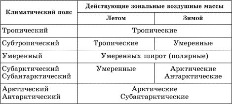 Таблица 2. Климатические пояса и действующие в них воздушные массы
