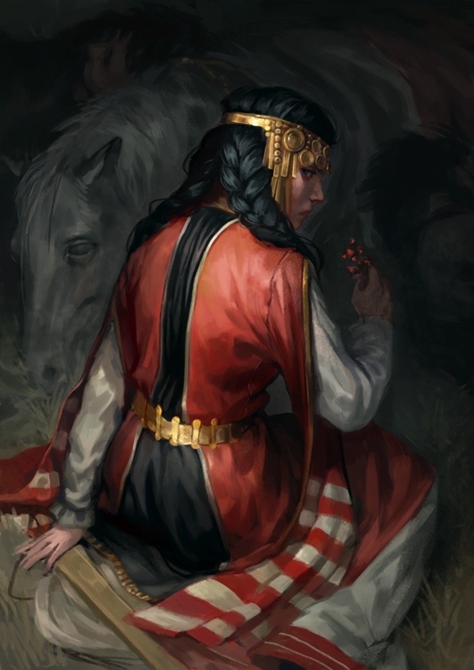 Рано утром она оделась в церемониальные одежды, поела, сидя на земле, и вместе с несколькими воинами отправилась к месту, где должны были хоронить царя.