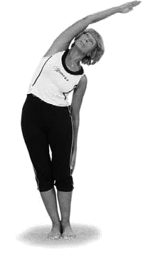 2. Медленно выдыхая, вытягивать позвоночник вправо, равномерно сгибая туловище, не допуская «излома» позвоночника в поясничном отделе и удерживая левую руку в неизменном положении. Ноги не расслаблять и в коленях не сгибать.