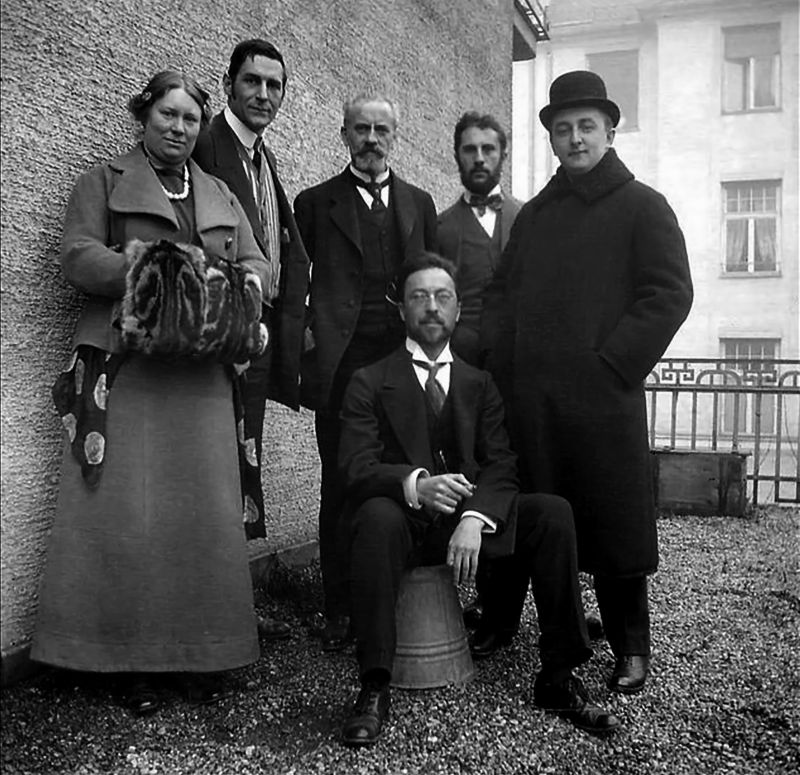 Василий Кандинский (сидит), Фома де Гартман (справа), Мюнхен, 1919; также на фотографии, слева направо: Мария Марк, Франц Марк, Бернхард Кёлер, Генрих Кампендонк