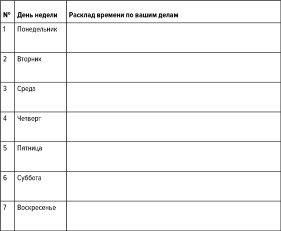 Напишите расклад своего времени на неделю. Занесите в таблицу по дням запланированные дела, указав, что делаете утром, в обед и вечером. Если не планируете дни, напишите – не планирую, не помню, что обычно делаю.