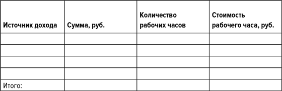 Давайте посчитаем стоимость вашего рабочего часа. Заполните таблицу, указав вашу сумму денег по всем своим источникам дохода (заработная плата, аренда, дивиденды и т. п.), а также сколько времени вы на это тратите.