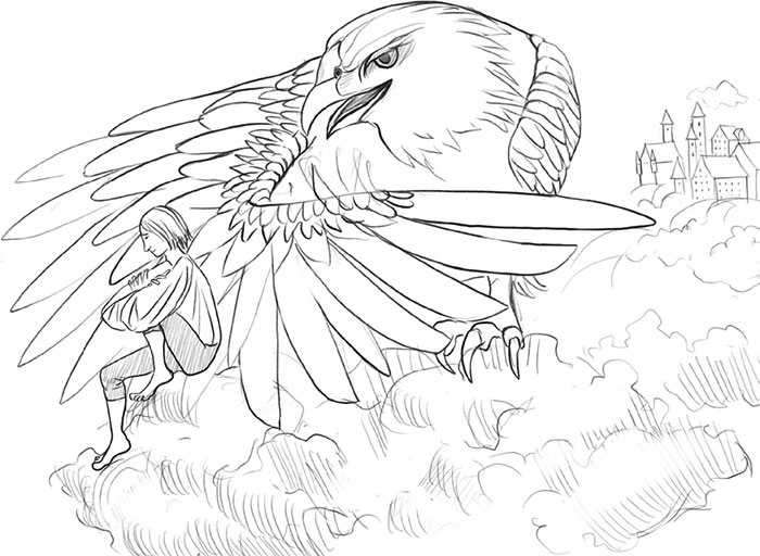 Опустив голову, Мир долго смотрел вниз, пытаясь разглядеть, что таится за облаками, как вдруг увидел под ногами пролетающую птицу. Обрадовался Мир, закричал со всей мочи, замахал руками, чтобы она его заметила. И тогда поднялась к нему птица. Рассказал ей Мир свою печальную историю, а птица и говорит: