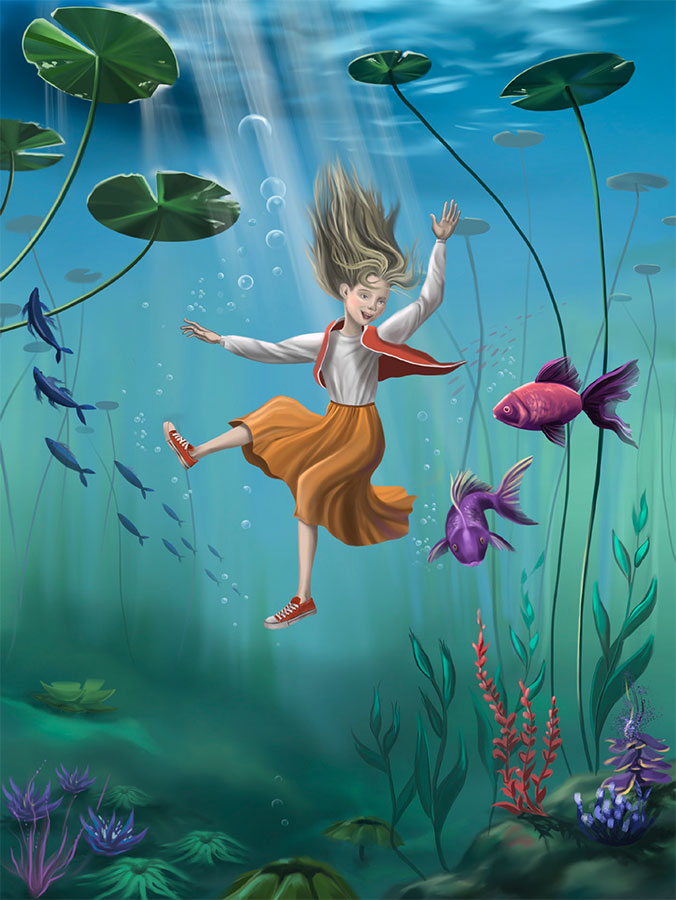 Через мгновение таинственная воронка исчезла, а в месте, где очутилась Агата, было на удивление спокойно и тихо. Девочка увидела подводный мир удивительной красоты, какой раньше она видела лишь на картинках. Повсюду плавали разноцветные рыбки, большие и маленькие, колыхались в воде необыкновенные растения, в тысячу раз красивее цветов, которые росли у матери в саду. Под ногами Агата обнаружила золотой песок со светившимися перламутровыми камнями.