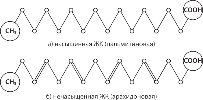 Ненасыщенные жиры отличаются тем, что в них некоторые атомы углерода «держат друг друга за руки» − это называется двойная связь (см. рис.). Наличие двойных связей делает жиры жидкими при комнатной температуре, и их принято называть маслами. Ненасыщенные жиры, в свою очередь, подразделяются на моно– и полиненасыщенные. Отличие только в количестве двойных связей в молекуле (одна − моно-, две и более − поли-). Чем больше масло имеет двойных связей, тем более низкая температура его замерзания и тем оно текучее.