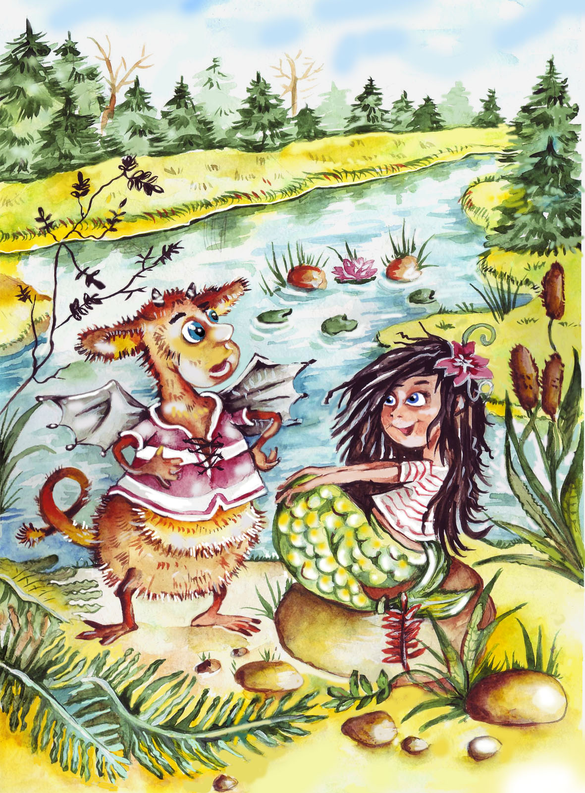 Любовался Квакахрям кувшинкой, как вдруг целый фонтан воды на него вылился. Обернулся он к речке, а там русалочка. Лохматая, злющая, пригрозила ему кулаком и давай хвостом по воде бить. Как из водяной пушки стрелять. Повернулся Квакахрям, да неудачно. Поскользнулся на мокрой земле, свалился, но кувшинку не помял.