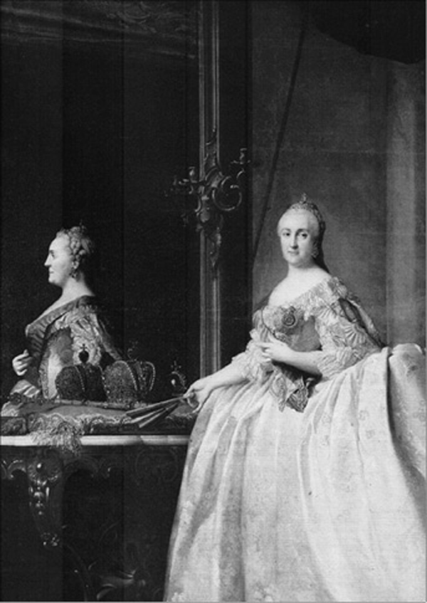 На одном из портретов кисти голландского живописца В. Эриксена Екатерина изображена у огромного зеркала. Императрица смотрит на зрителя, а мы можем наблюдать ее одновременно в профиль и фас. Сзади, за небрежно откинутой драпировкой, еще одно зеркало, оно тоже ловит и бесконечно умножает изображения государыни. Создается впечатление, что куда бы ни повернулась Екатерина, она повсюду увидит самое себя.