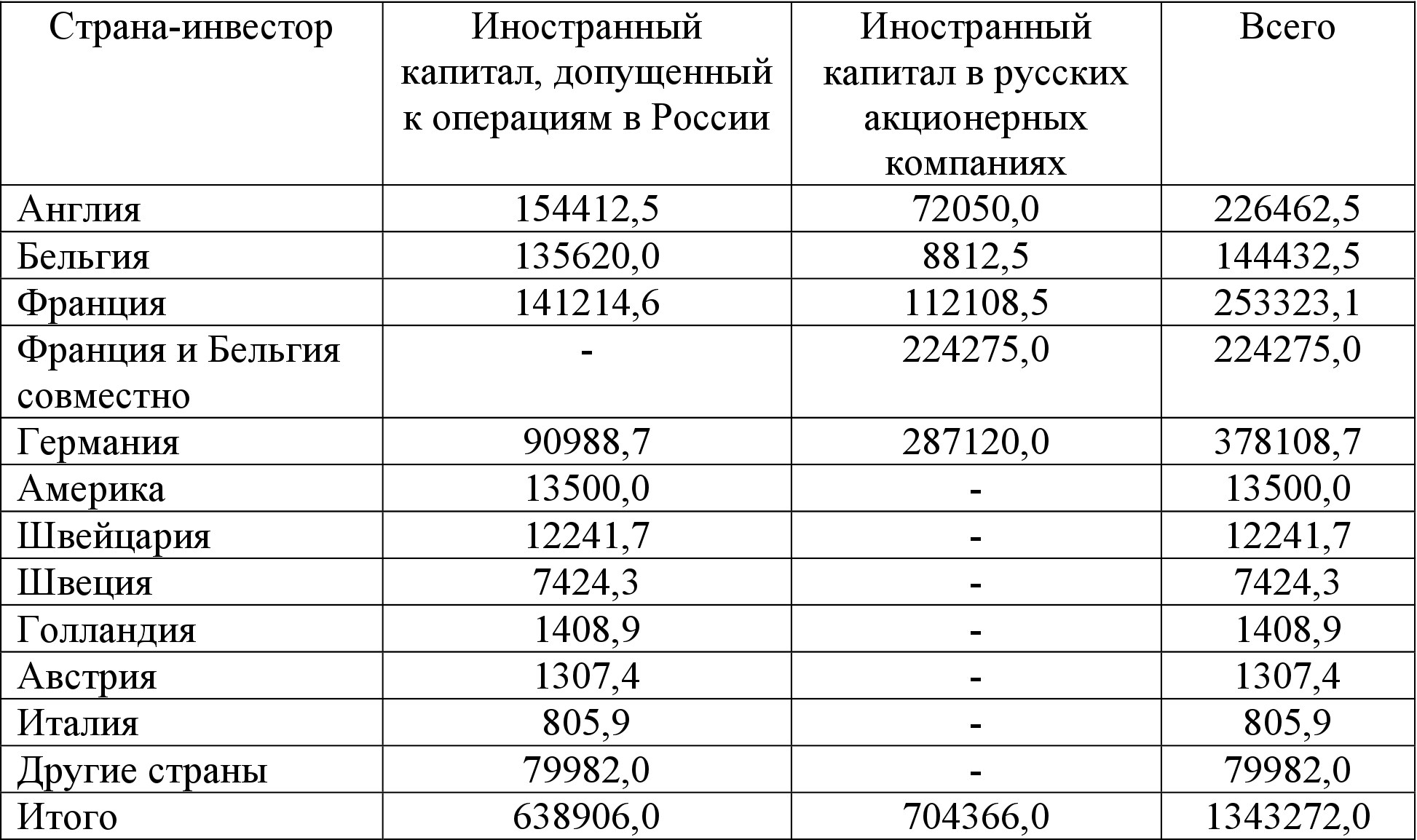 Создание законодательной базы, регулирующей деятельность иностранных предпринимателей на территории Российского государства, несмотря на свой ограничительный характер, способствовало тому, что с 1910 г. иностранные инвестиции «прямо хлынули в страну».234 Именно поэтому М.И. Мышь писал: «… иностранцы не могли жаловаться на негостеприимство России. И если в последнее 25-летие изданы некоторые ограничительные для них постановления на владение недвижимыми имуществами в пограничных губерниях, то в этом следует винить те обострившиеся международные политические отношения, которые сложившись против интересов России, вынуждали русское правительство быть настороже и принять необходимые меры для охранении безопасно своих границ».235