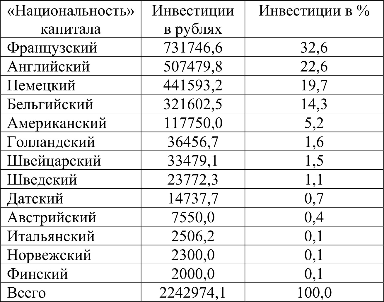 В годы промышленного подъема начинается массовое проникновение иностранного капитала в Россию, в том числе и германского. К началу XX в. в стране насчитывалось 227 иностранных акционерных компаний, из них бельгийских – 131, английских – 38, французских – 31, германских – 13.464