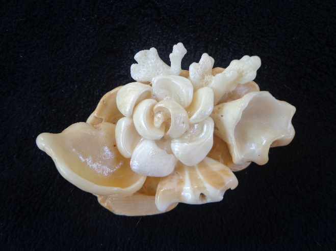 Она словно создана для растительного натюрморта. Требуется добавить совсем немного, например, стилизованный цветочек из маленькой устричной створки с волнистыми краями и сердцевины из небольшого кораллового кругляшка.