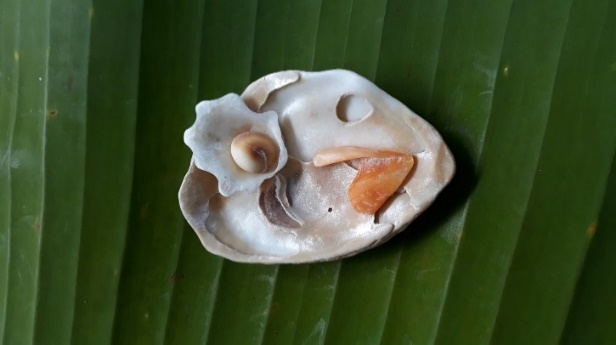 например, стебель. Для этого я использую типовой обломок от цветной улиточной ракушки. Белый фрагмент можно трактовать как смятый листик.