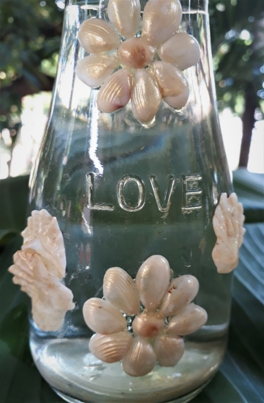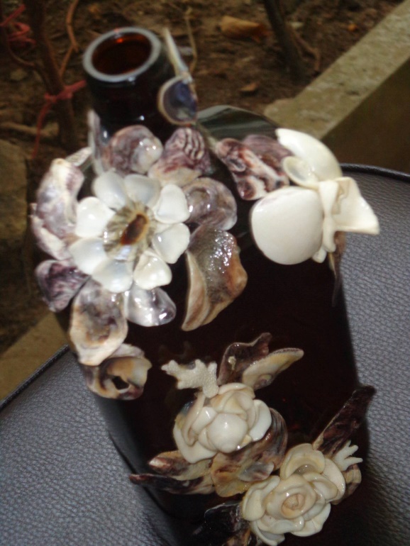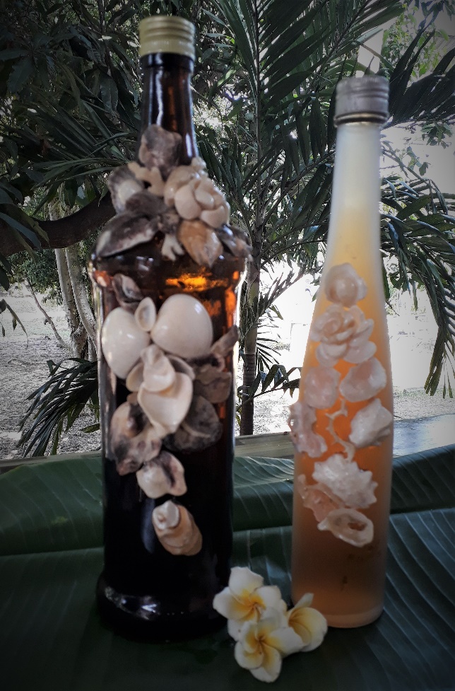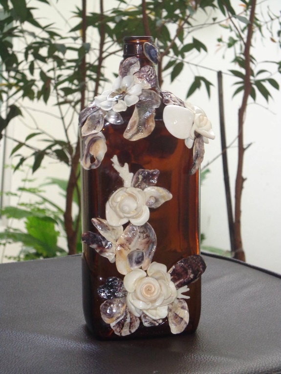 Можно дать совет? Если вам досталась бутылка из темного стекла, подбирайте ракушки для «цветов» белого цвета. На прозрачном стекле хороши темные. Однако белые ракушки на светлом тоже смотрятся великолепно, особенно если жидкость будет цветная.
