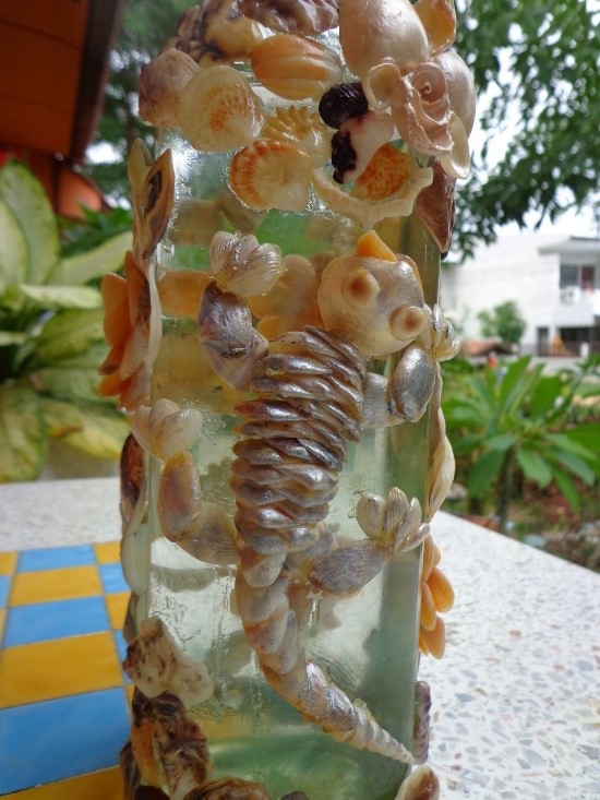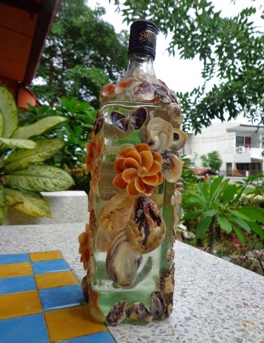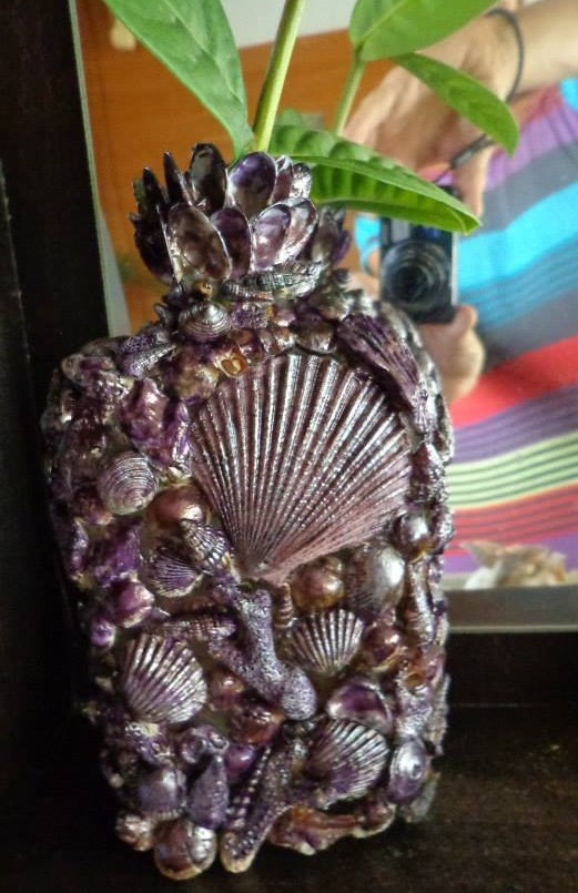 Крупная бутылка с плоскими гранями из-под джина или рома словно специально создана для ракушечных аппликаций.