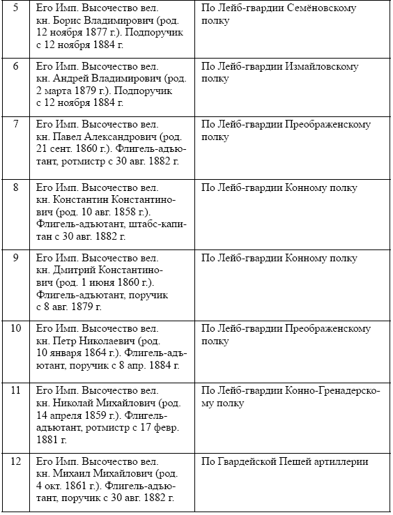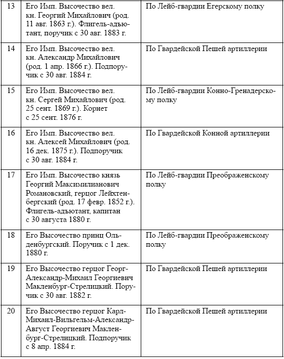 Как видим, в данном списке представлено 20 лиц императорского дома, которые числились по 6 прославленным гвардейским полкам русской армии и 3 артиллериям: по лейб-гвардии Преображенскому полку, лейб-гвардии Семёновскому полку, лейб-гвардии Измайловскому полку, лейб-гвардии Конному полку, лейб-гвардии Конно-Гренадерскому полку, лейб-гвардии Егерскому полку, лейб-гвардии Пешей артиллерии, лейб-гвардии Конной артиллерии, гвардейской Пешей артиллерии [32, л. 1–5].