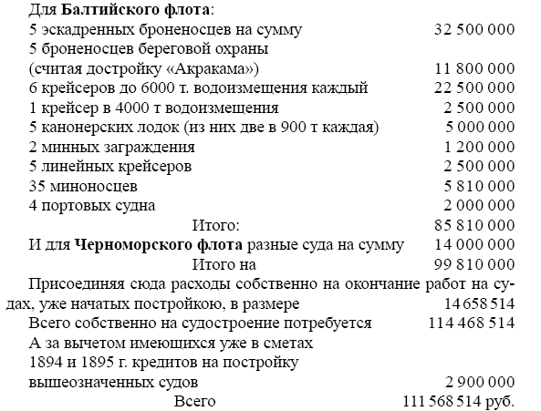 Между тем настоятельная необходимость не только не отставать от иностранных флотов, но, по возможности, идти вперед в деле наибольшей боевой способности новых судов нашего военного флота и скорости их хода, требует обязательной постройки судов новейших типов, больших размеров и снабженных сильнейшим, чем требовалось прежде, механическим вооружением. Поэтому, согласно вновь составленному плану судостроения на предстоящее семилетие, стоимость предполагаемых построек, не считая артиллерийского и минного вооружения, выражается в следующих цифрах: