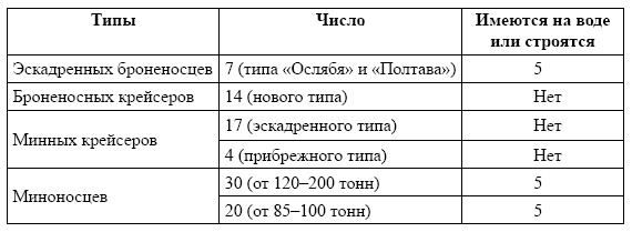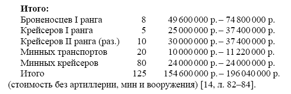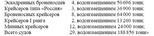 Предлагая вышеозначенную программу судостроения для противодействия японскому флоту, я имел в виду, чтобы все суда не были приурочены специально для морской войны с одной Японией, но чтобы в случае войны с Англией они вполне отвечали требованиям войны с первоклассной морской державой [14, л. 40].
