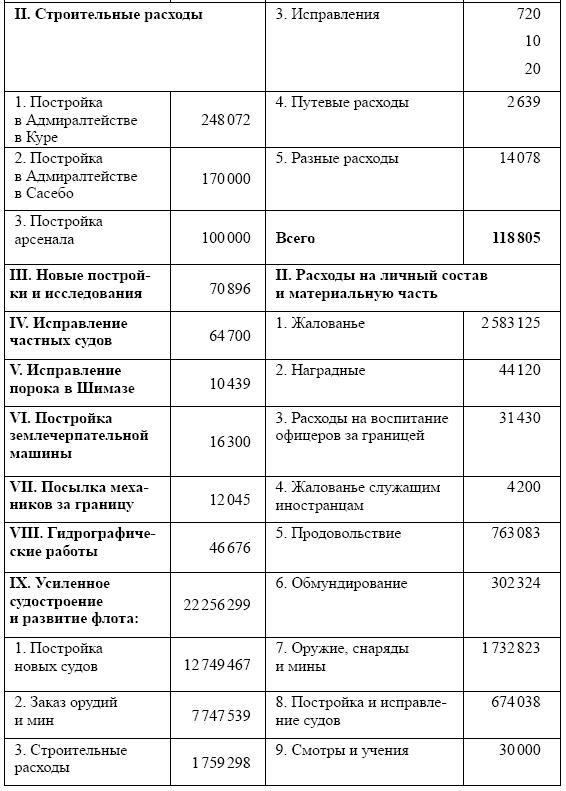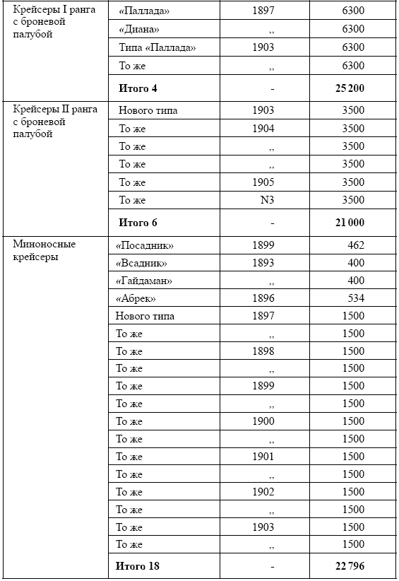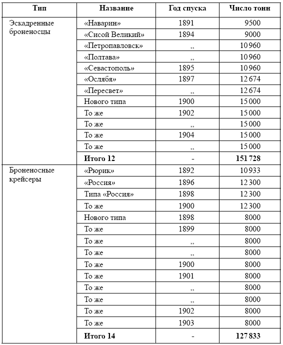 Из приложенного плана судостроения видно, что С.-Петербургский порт в состоянии построить в семилетний период 29 судов, водоизмещением 188 856 тонн, но при условии, если будут расширены мастерские при Новом Адмиралтействе и на Галерном острове. В число судов, могущих быть построенными, вошли три крейсера типа “Россия”; эти суда не введены мною в состав эскадры Тихого океана 1903 года, но они необходимы для крейсерских операций против Англии [14, л. 39–40].
