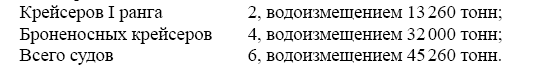5 крейсеров I ранга, водоизмещением около 8000 тонн. Ход 19 узлов. Запас угля на 15 000 миль. Вооружение XII – 6” (дюймов. – О. Ф.) скор., VI – 47” скор. Броня по ватерлинии и броневая палуба.