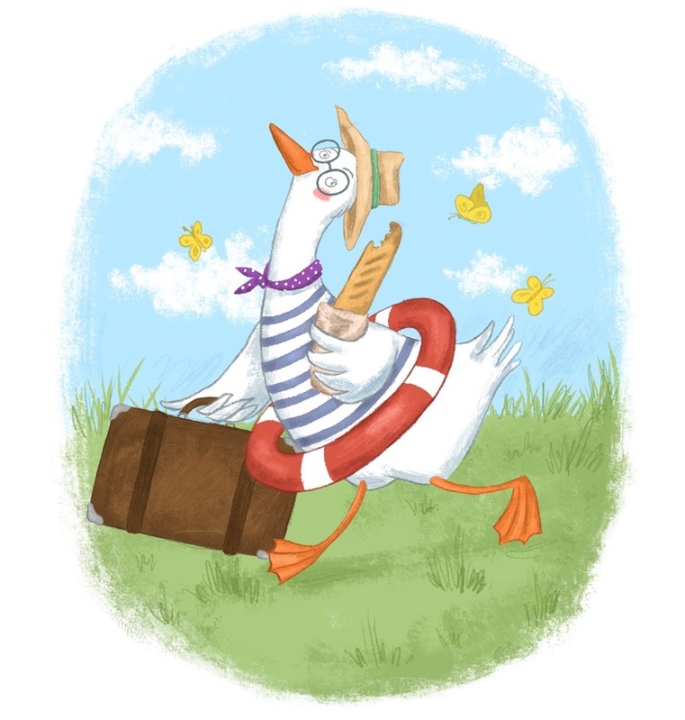 Когда автобус довёз нашего героя до деревни, её жителям предстало весьма забавное зрелище. Двери автобуса открылись, и в проходе появился белоснежный гусь в соломенной панаме, полосатой тельняшке, коралловом шейном платке и с красным спасательным кругом на пухлой талии. Рядом огромный чемодан. Под мышкой вторая половина багета. Купив багет в дорогу, гусь первую успел умять.