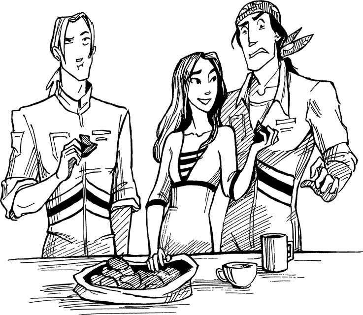 Гостье торжественно представили остальных членов экипажа, включая кошку. Последняя изобразила на морде крайнее омерзение, задрала хвост и величественно удалилась под стол, намекая, что единственная польза от гостей – это внеплановая трапеза. Хозяева оправдали ее ожидания: Полина побежала наполнять чайник, Дэн расставил посуду, а Лика вытащила из чемодана головку домашнего сыра и большой пакет с печеньем.