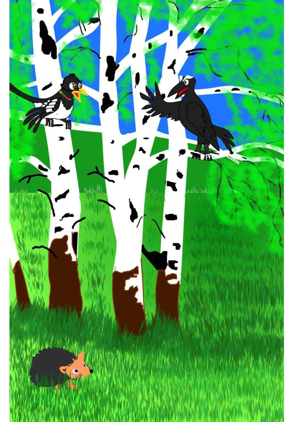Когда ежик подбежал к березе, то он услышал, как сорока разговаривала с вороном. Ежик стал случайным свидетелем их интересного разговора.