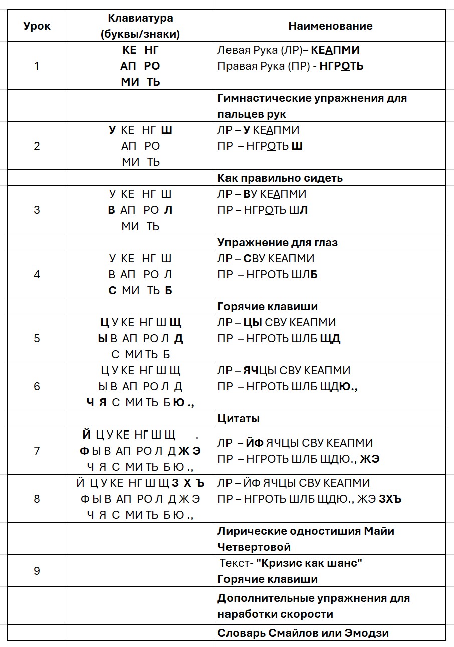 Каждый урок состоит из 1) вводной части, 2) примеров,3) упражнений и 4) дополнительных домашних заданий. А также есть Дополнительные материалы, которые разнообразят обучение и помогут развить скорость печати.
