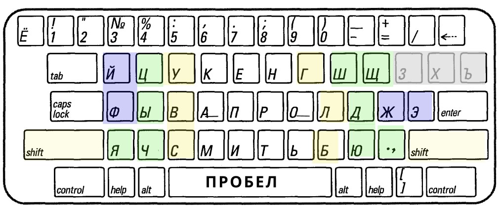 Следите чтоб каждый пальчик отвечал за свои буквы. Между каждым словом нажимайте на «Пробел» – Большим пальцем (любой руки, на ваш выбор)