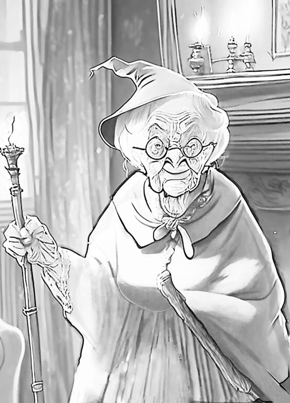 Элиас осторожно выглянул из своего укрытия. Во дворе появилась высокая, худющая, словно жердь, старуха. Лицо её напоминало сушёную сливу; глаза были маленькими, как у свинки; нос – горбатым, точно клюв хищной птицы; уши торчали в разные стороны. Это была очень странная старуха, одетая в старомодную мантию и островерхую шляпу с широкими полями.