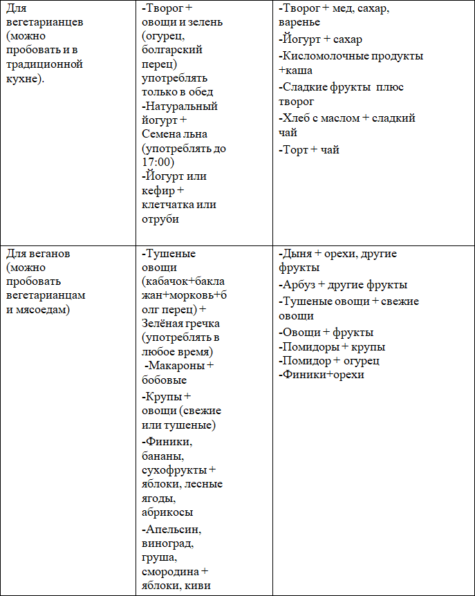 Сочетание продуктов еще одна составляющая грамотного и «правильного» снижения веса. Сочетая продукты правильно, мы обеспечиваем нашему организму слаженную работу. Продукты, тем самым, лучше усваиваются в организме, не вызывая процессов гноения, брожения и вздутия. Например, нельзя сочетать помидор+огурец, так как один имеет кислую среду, другой щелочную. В организме такое сочетание образует процессы брожения, что останавливает снижение веса. Или, например, нельзя сочетать мясо+ картофель или макароны.