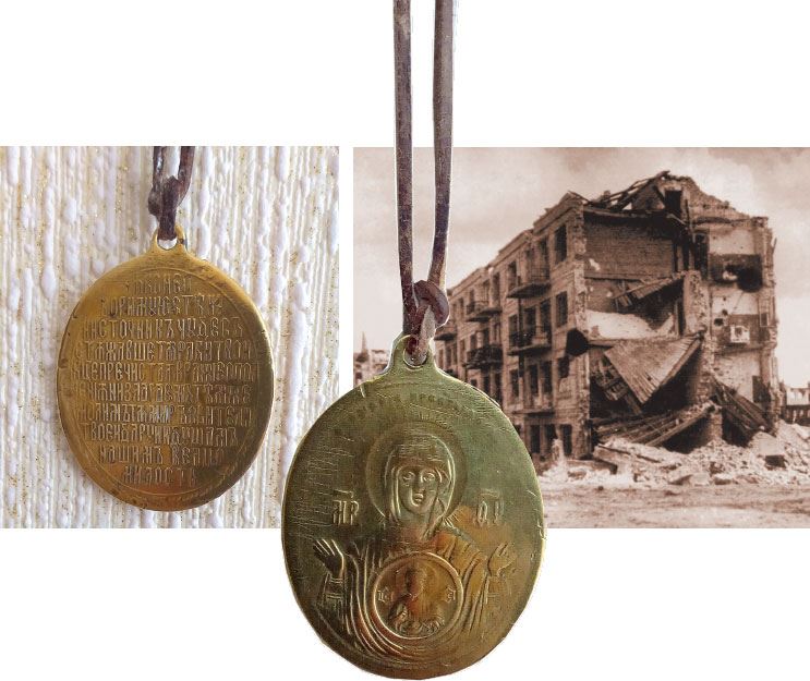 Иван Филиппович, лейтенант Афанасьев, вздохнул: «Взрослые умирают, а это ребе-дома Павлова в дни нок…» Неожиданно лопата коснулась металлического предмета – оказалось, что это иконка Божией Матери «Знамение». Ее положили ко мне в «пеленки» – солдатские портянки. И я стала оживать… Этот медальон до сих пор висит у меня над кроватью.