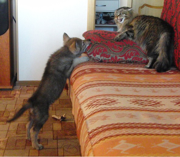 Он не сразу, но усвоил, что кошек гонять нельзя. Добиваться этого пришлось почти три недели, но результат есть. Канис понял, что кошка Ульси хочет с ним играть, но он больно хватается зубами и пришлось его отучать от этого.