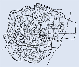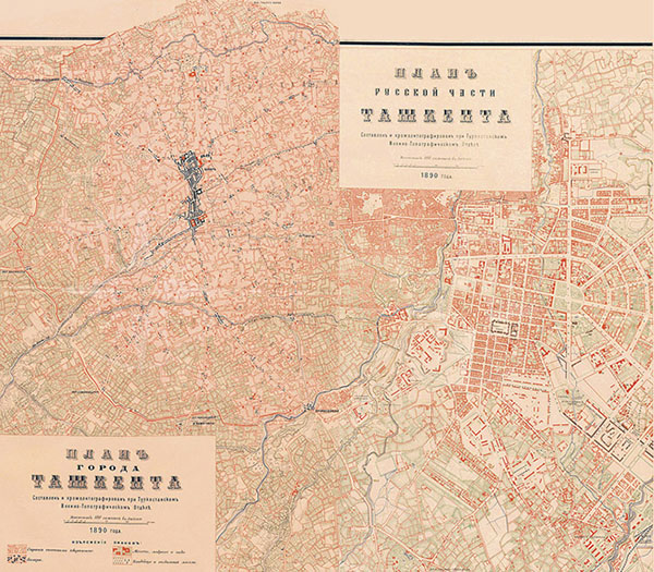 К моменту российской колонизации (1865) Ташкент был крупнейшим городом Центральной Азии по площади и населению, хотя и не имел столичного статуса Коканда, Хивы и Бухары. Холмы ташкентского оазиса скрывали немало древних и раннесредневековых городищ и замков, однако собственно исторический город с IX–X вв. развивался вокруг ядра Чорсу[1], к которому примыкали четыре городских района-даха: Кукча, Шейхантаур, Сибзар и Бешагач. Главные улицы, подобно артериям, сходились к Чорсу, где располагался самый большой городской базар. От них более узкие улочки, разветвляясь, расходились к периферийным кварталам с их небольшими мечетями и махаллями[2]. В черте исторического города было немало памятников средневековой архитектуры и как минимум три крупных культовых комплекса: Хаст-Имам – в квартале Сибзар, Шейхантаур – к востоку от Чорсу и Регистан – непосредственно в главном городском ядре. Обнесенный крепостной стеной, город располагался по правому берегу канала Анхор за исключением хорошо укрепленной крепости Урда, резиденции наместника кокандских ханов, от которых Ташкент административно зависел. Урда была выстроена на левом берегу Анхора, что позволяло крепости предохранять город от внешних вторжений и защищать правителя от внутренних волнений.