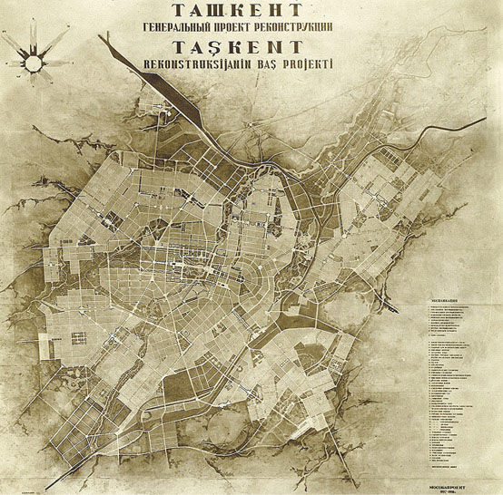 Новый генплан Ташкента, разрабатываемый с конца 1950-х годов, создавался на системной четырехступенчатой основе. Несколько жилых групп образовывали микрорайон, несколько микрорайонов – жилой район, несколько жилых районов – планировочный район, с подчинением единице каждого уровня унифицированного набора культурных, социальных, бытовых и других объектов и служб. Новыми планировочными районами Ташкента были задуманы Чиланзар, Каракамыш, Юнусабад, Сергели и т. д. В городе начали действовать железобетонные комбинаты, возводившие жилые микрорайоны по лицензионной технологии французского инженера Раймона Камю. Особое значение в этой унифицированной системе имел городской транспорт. Его разработка, включавшая скоростные магистрали и линии метро, стала составной частью генерального плана. Кульминацией этой работы стали два всесоюзных конкурса: на центр Ташкента, который был выделен в особый планировочный район (этот конкурс выиграли архитекторы института Ташгипрогор), и на застройку центральной площади Ташкента (здесь победителями стали бригады Ташгипрогора и московского ЦНИИЭП зрелищных зданий и спортивных сооружений). Идея победившего проекта центра Ташкента заключалась в пробитии пешеходной зеленой эспланады, соединявшей ядра «нового» и «старого» города – сквер Революции и площадь Чорсу. В пространстве эспланады предполагали возвести свободно размещенные в зелени уникальные объекты республиканского и городского культурного и административного назначения.