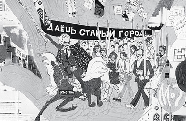 Карикатура «Даешь старый город!» (на коне – А. Косинский) из стенгазеты Ташгипрогора «Градостроитель». 1977