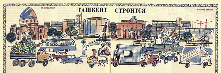 М. Скобелев. Ташкент строится. Иллюстрация из журнала «Мурзилка». 1969