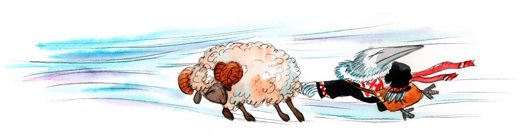 Путники уже покинули горы и шли по равнине. Жилья не попадалось. Зато невдалеке стоял стог сена. Держась друг за друга, ворон и Баран попытались прорваться сквозь ветер к спасительному укрытию. Вихрь отбрасывал их назад.