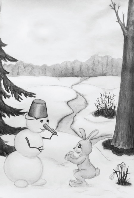 Жил возле дома Снеговик.Он к снегу, холоду привык.Ведро, две ветки и морковка.Его слепили дети ловко.Но солнце грело всё сильнее.А птицы щебетали веселее.Природа оживала понемногу.«Весна пришла! Весне дорогу!» —Кричали шустрые скворцы.И пели соловьи-певцы.Снеговика всё это раздражало.Он заболел, и плохо ему стало.Сорока прилетела, медсестра:«Лечиться, Снеговик, тебе пора.На, съешь скорее витаминку,Держи прямее свою спинкуИ не сутулься… улыбнись!От солнца дальше ты держись».