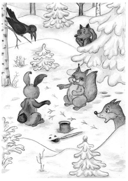 Всё стихло, замерло вокруг.Сковал какой-то всех испуг.Все замолчали в ожидании.Уже в восторженном молчанииСклонилась леса голова.Пришла красавица ЗимаХозяйкой белоснежною,Холодною и снежною.Сугробы быстро намела,Сковала реки льдом она,Всё инеем покрылаИ в вальсе закружила…Снежинок лёгкий хороводПарил, не замедляя ход.Пурга с Метелью озорнойПлясали польку вразнобойСмешно и неумело.Ветра гудели смело,Чтоб знала матушка-земля:Хозяйка тут теперь Зима!Зайчонок по лесу скакал.Ещё он шубку не менял —Забыл, наверно, не успел.По лесу бегал всё да пел:«Сменить бы шубку поскорей!И станет Заиньке теплей.Моя совсем уж старая,Вся серая, линялая!»Ворона каркнула: «Беда…Плохая шубка у тебя.Смотри, я модница какая!Из перьев шуба дорогаяМеня спасёт от холодов.А ты, я вижу, не готовЕщё к зиме суровой.Но будешь ты с обновой!»Ворона кисточку взялаИ красить Зайца началаКраскою зелёной,Светлой, золочёной.По лесу Заяц поскакалИ Волка Вову повстречал…Промолвил тот сердито:«Такого индивидаЕщё не видели у нас…Смеяться буду целый часЯ над такой зверюшкой —Цветной Зая-Лягушкой».И Волк скорее убежал…А Заяц дальше поскакал.