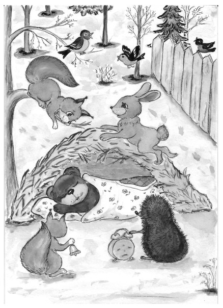 Исчезли снежные метели.Скворцов таинственные трелиЗвенели. Солнышка лучиУже приятно горячи,Хотели землю всю согреть.И только спал в лесу Медведь.Храпел, ворочаясь вздыхалДа лапу всё свою сосал.Во сне в большой ракете,На дальней на планетеОн кушал сладкий мёд.Потом его народУж на Земле встречалИ мёдом угощалНежно-золотистым,Вкусным и душистым.Спал Мишка, наслаждался.Никак не просыпался…Зайчики его будили,По берлоге колотили,Бегая со всех сторон,Создавая перезвон.Ёж будил его весёлый,Заводил будильник новый.Птички щебетали,Мишку поднимали.Бесполезно было всё!Просыпаться нелегко…И только Волк довольный,Проказник своевольный,Вороне говорил:«Я власть тут захватил!Начальник я теперь в лесу!И победить смогу Лису,Всех белок и Зайчишку.Не разбудить бы Мишку…Пускай он лето всё храпит,А за порядком проследитКрасавчик серый Волк.Я в управленье знаю толк!Ты мне, Ворона, помоги.Кто подойдёт – скорей буди!Пойду немного отдохну.Хозяин я теперь в лесу!»Лиса бежала, напеваяДа ручейки в лесу считая:«Один, два, три», – и так до ста.Любила математику Лиса.Видит – Мишка спит в берлоге.И Лисица на порогеГромко начала кричать,Лапками стучать, стучать:«Миша, Миша, хватит спать!Выходи скорей гулять!Просыпаться уж пора.В лес давно пришла Весна!»А Ворона: «Кар-кар-кар!»Волк проснулся, прибежал.Шишку взял мгновенноДа зарычал надменно:«Кто в лесу гуляет?Кто мне спать мешает?Догоню тебя, Лиса.Будешь бегать без хвоста!»Волк Лисицу догонял,Шишками в неё кидал…Ему Ворона помогала,Бедную Лису клевала,Каркая беспечно:«Это будет вечно!»Заплакала Лисичка и ушла…Бежала по лесу онаИ Белку повстречала.Всё-всё ей рассказала:«И как теперь нам поступить?Медведя надо разбудить!»Сказала Белка: «Ерунда!Всё сделаю в два счёта я!»И по дороге побежала,Но вот берлогу не узнала…Там забор стоял высокий,Вырыт был и ров глубокий.Это Волк всё смастерил.Он Вороне говорил:«Ты, Каркуша верная,Помощница примерная.Ты берлогу стереги!А кто придёт – меня буди!Пойду немного отдохну.Хозяин я теперь в лесу!»Лиса и Белка прибежали,По забору застучали:«Миша, Миша, хватит спать!Выходи скорей гулять!Просыпаться уж пора.В лес давно пришла Весна!»А Ворона: «Кар-кар-кар!»Волк проснулся, прибежал.Шишку взял мгновенноДа зарычал надменно:«Кто в лесу гуляет?Кто мне спать мешает?»Волк Лисицу догонял,В Белку шишками кидал…Ему Ворона помогала,Белку и Лису клевала,Каркая беспечно:«Это будет вечно!»Заплакали подруги и ушли…