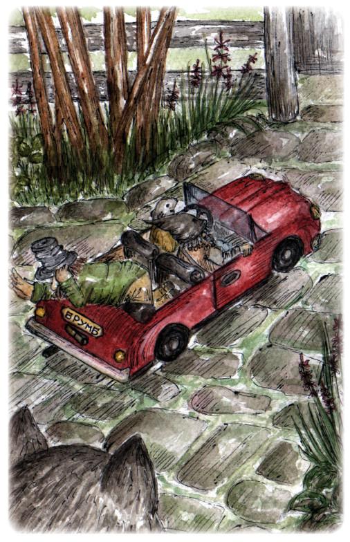 Брумбурумб заревел и понёсся по двору. Это оказалось не так уж весело, как представлял себе мистер Бубл. Лори крутил во все стороны руль, отчего брумбурумб бросало из стороны в сторону. Мистер Обер истошно вопил, вцепившись в ручку дверцы. А мистер гном трепыхался позади, наполовину вывалившись за борт.